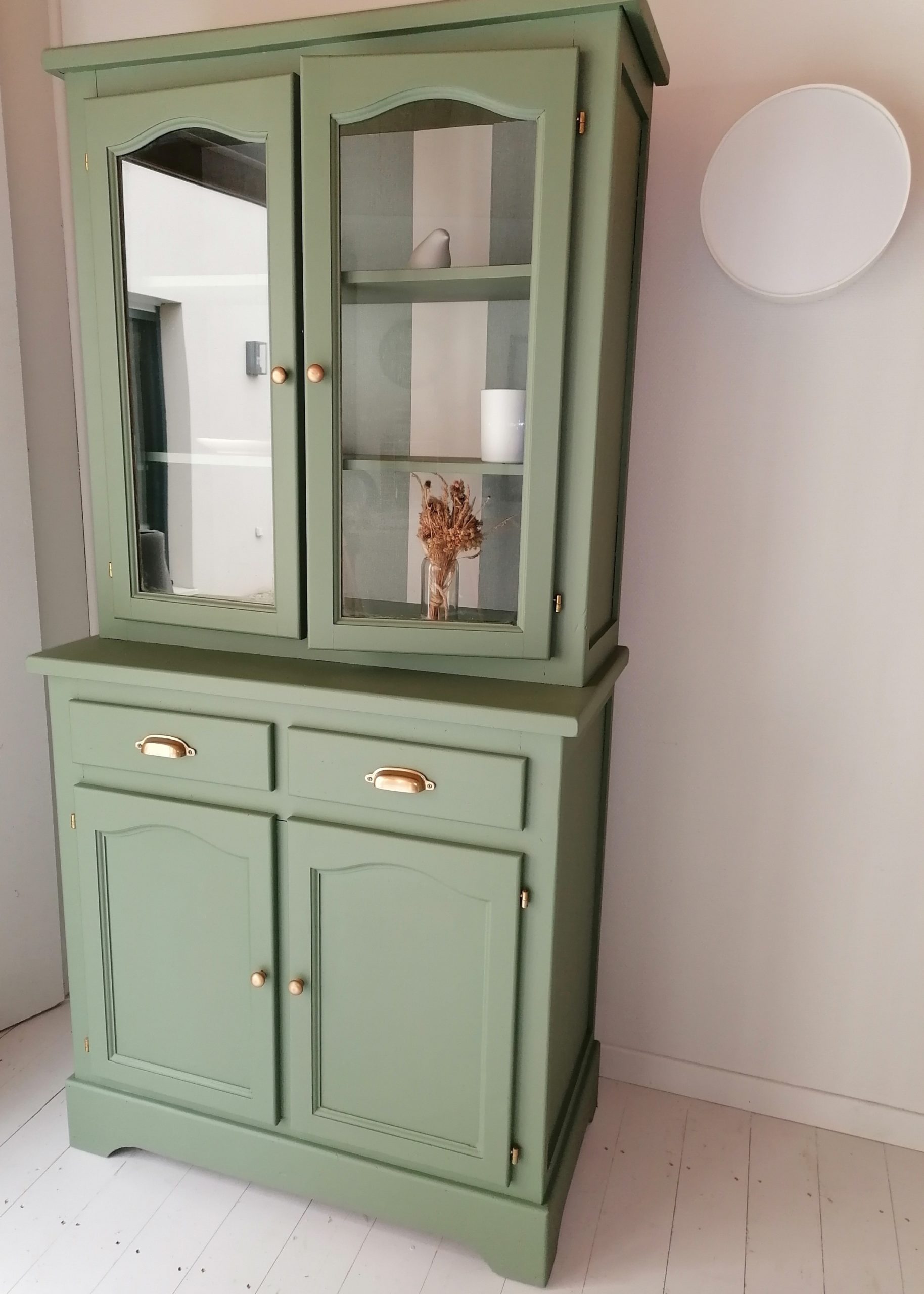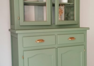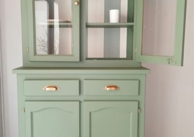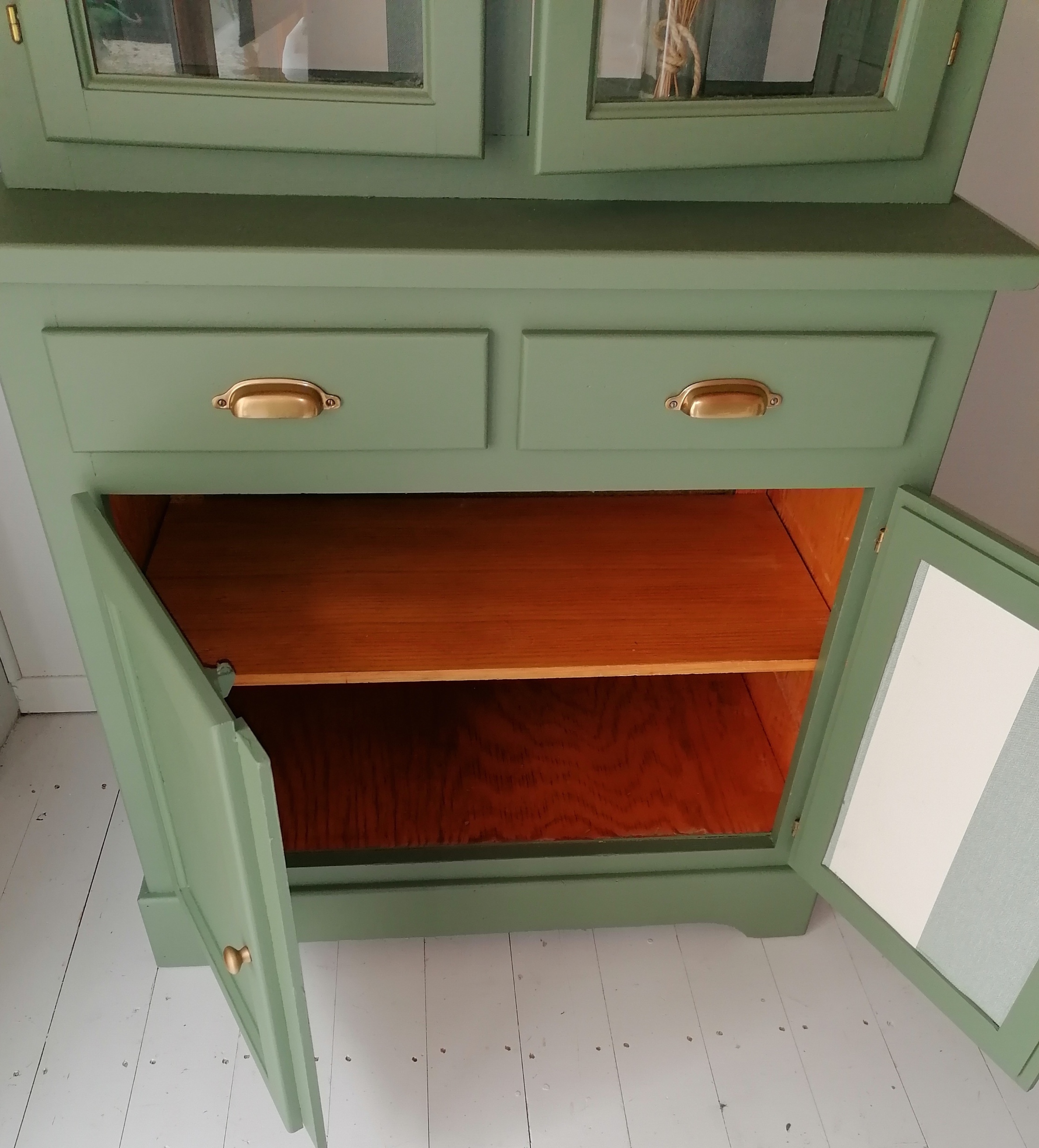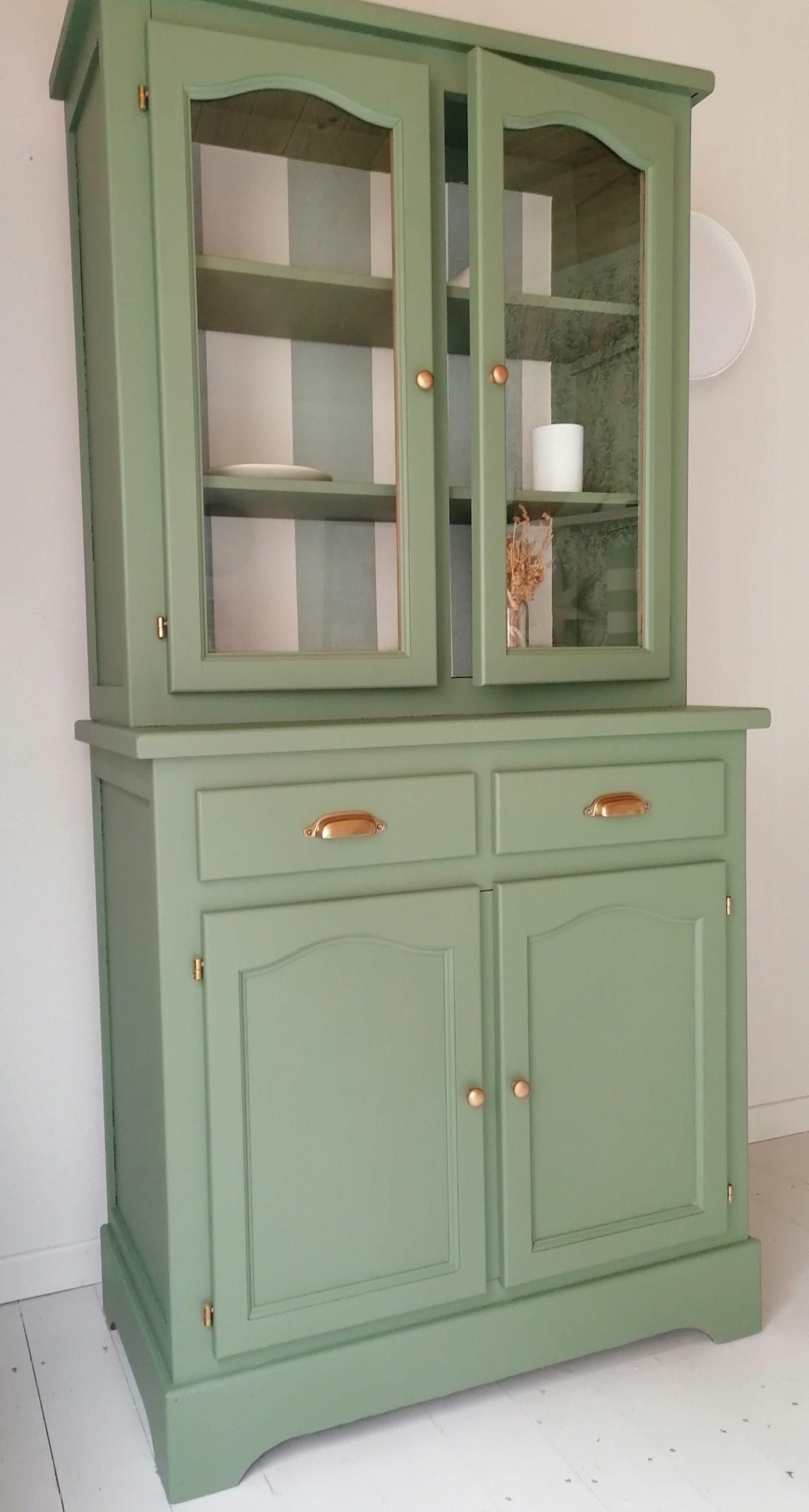 Vend vaisselier entièrement rénové. Le meuble a été repeint en vert + application d’un vernis de finition sur l’extérieur. Il se compose de deux tiroirs et d’une étagère en partie basse et de deux portes vitrées avec deux étagères en partie haute. Application d’une jolie tapisserie dans le fond du meuble et à l’intérieur des tiroirs. Toutes les poignées ont été changées.