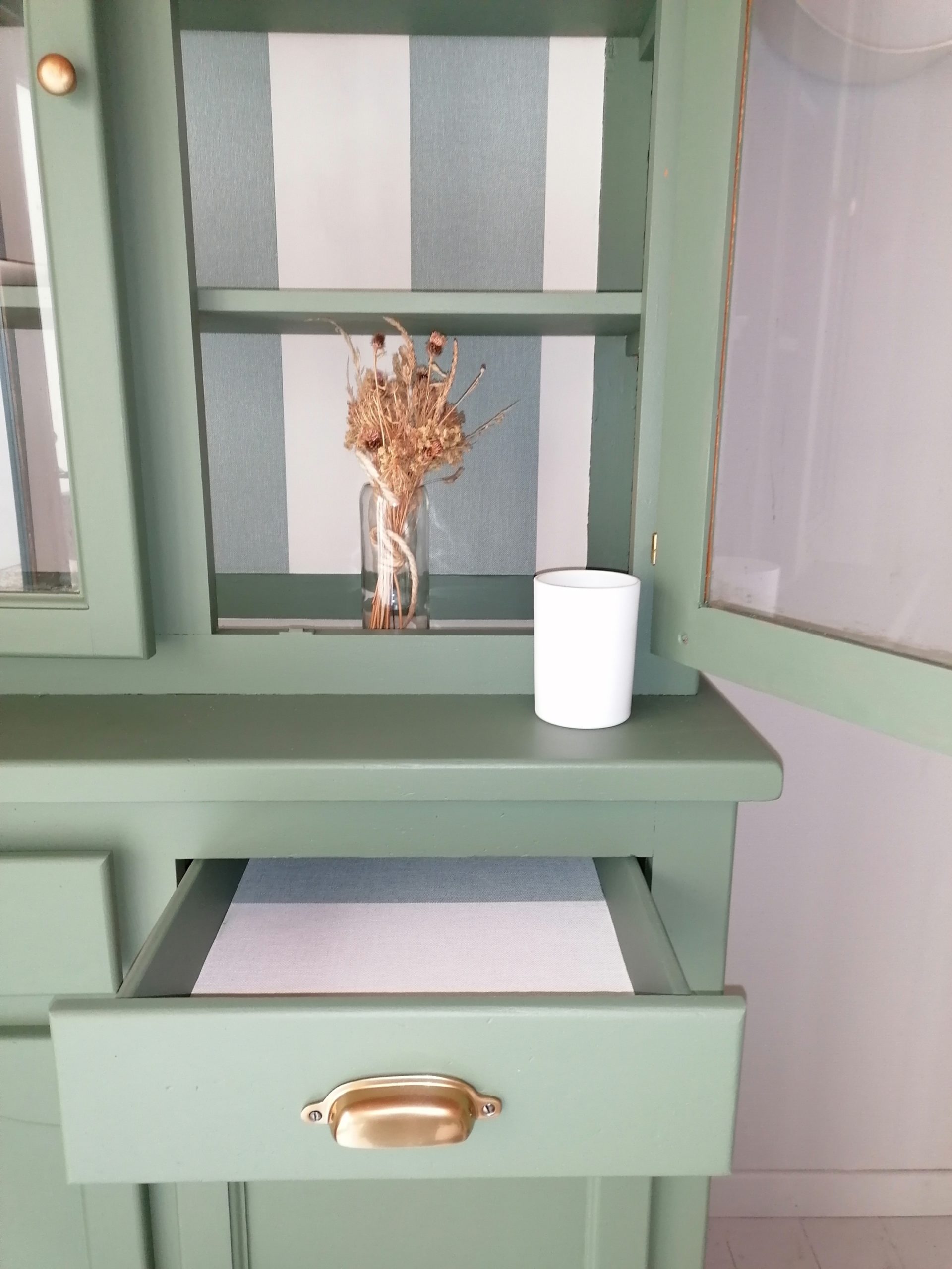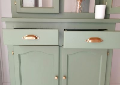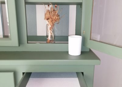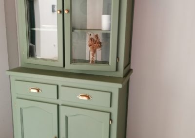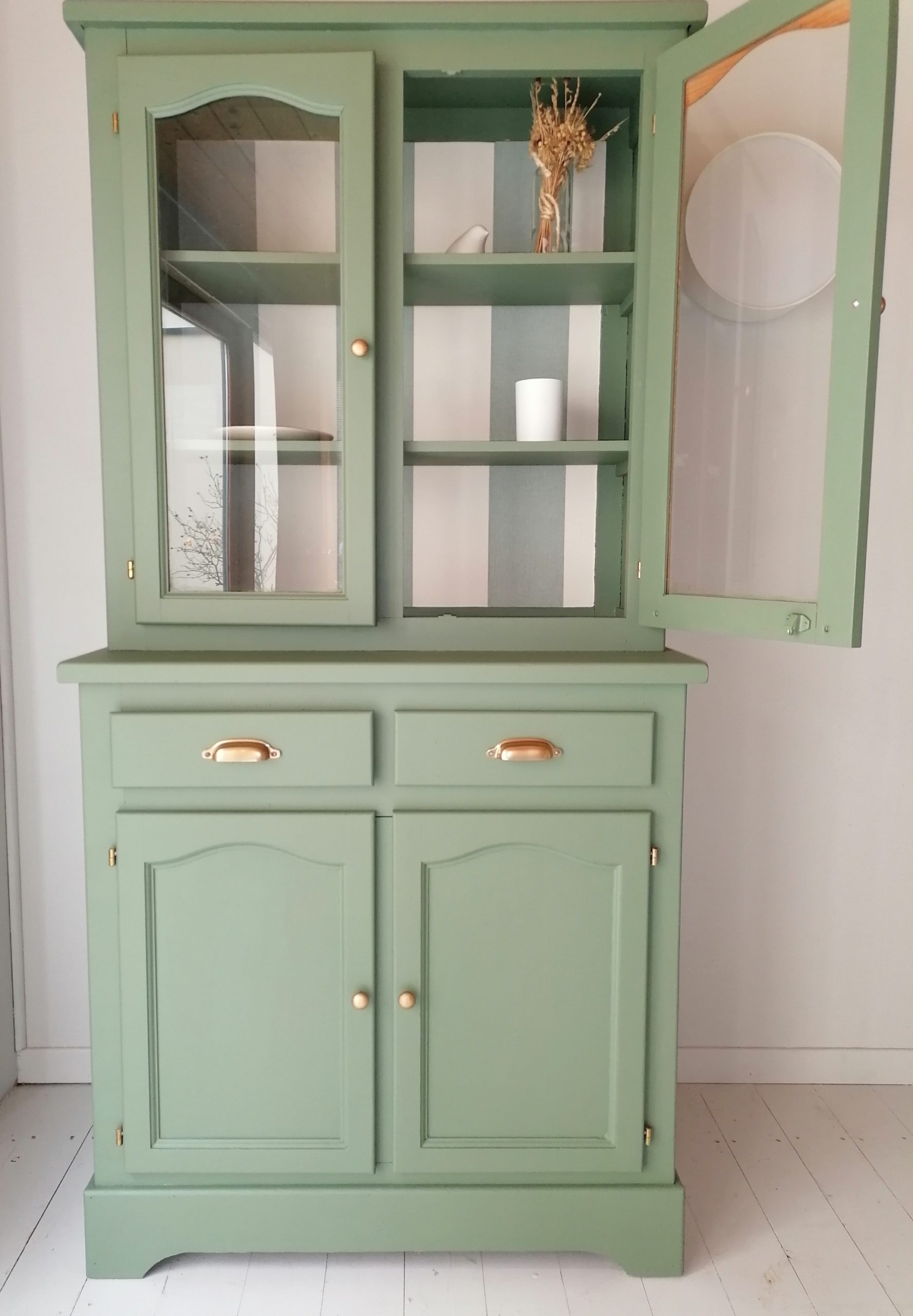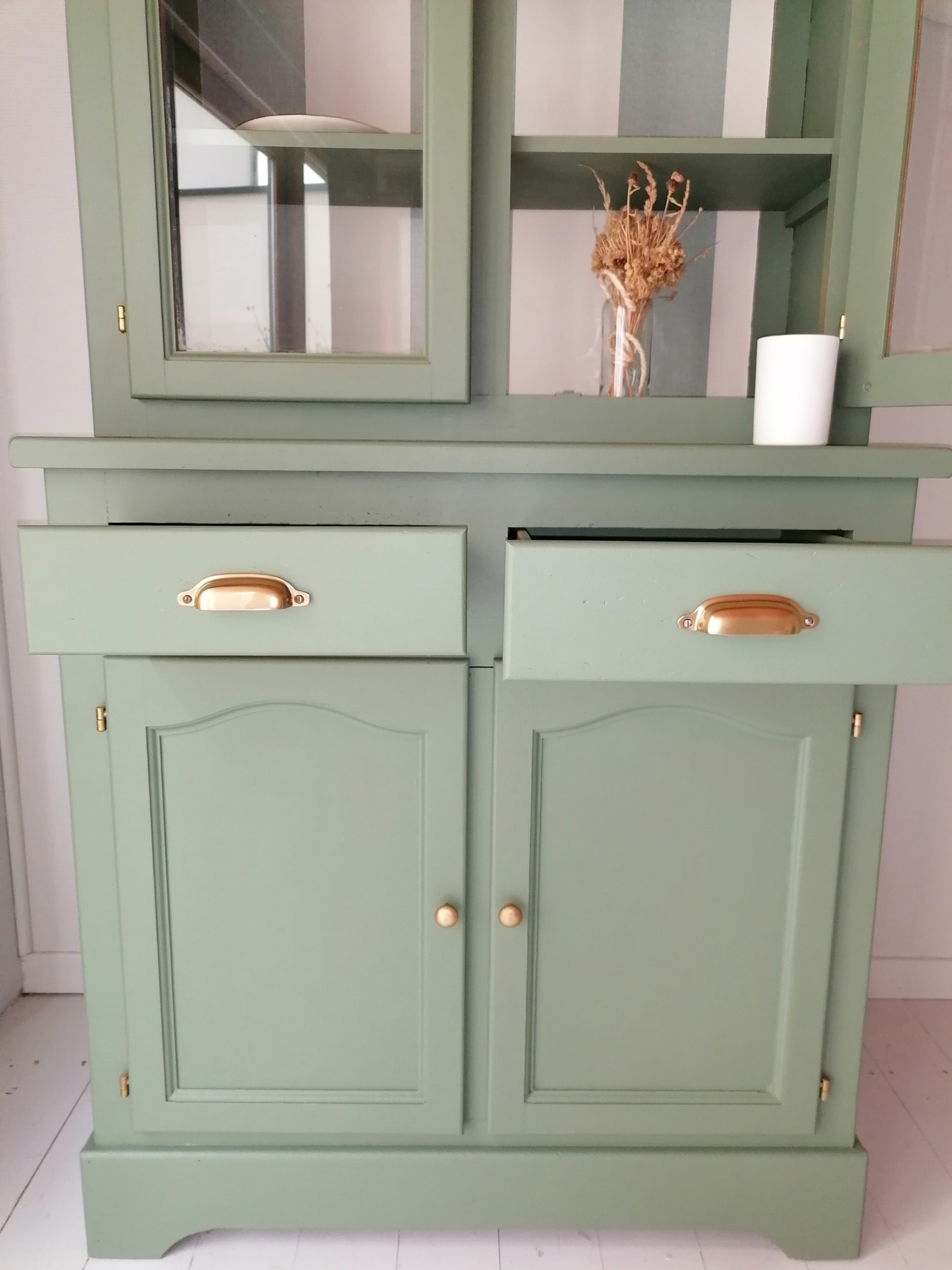 Vend vaisselier entièrement rénové. Le meuble a été repeint en vert + application d’un vernis de finition sur l’extérieur. Il se compose de deux tiroirs et d’une étagère en partie basse et de deux portes vitrées avec deux étagères en partie haute. Application d’une jolie tapisserie dans le fond du meuble et à l’intérieur des tiroirs. Toutes les poignées ont été changées.